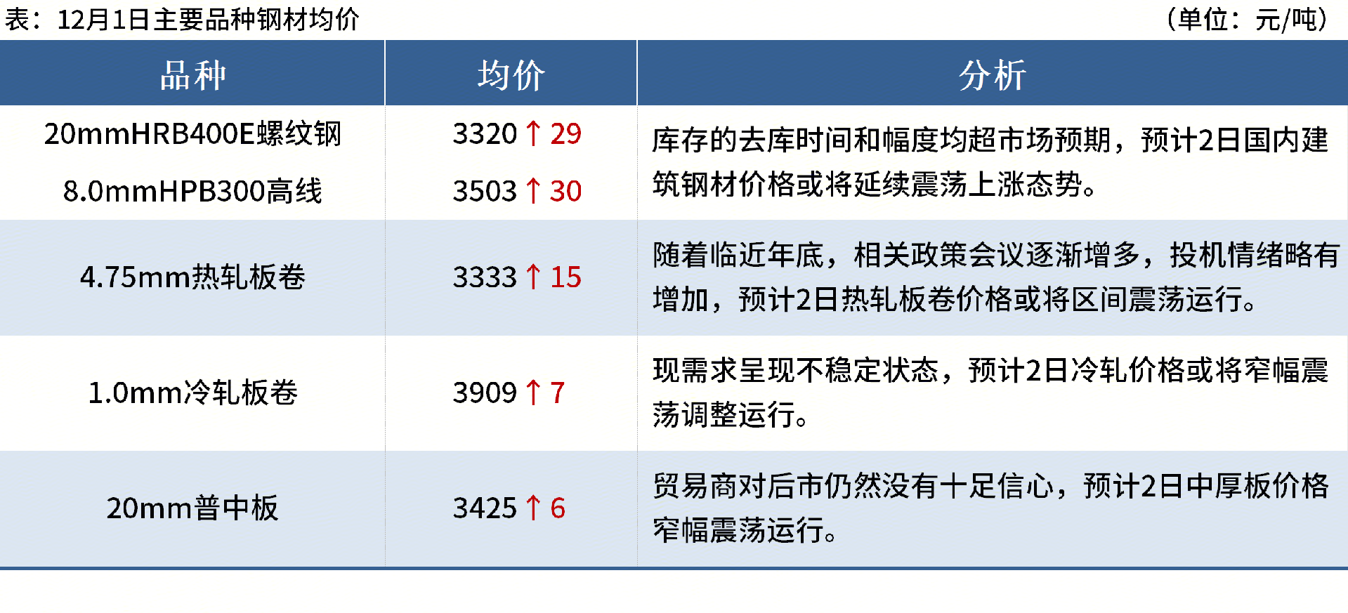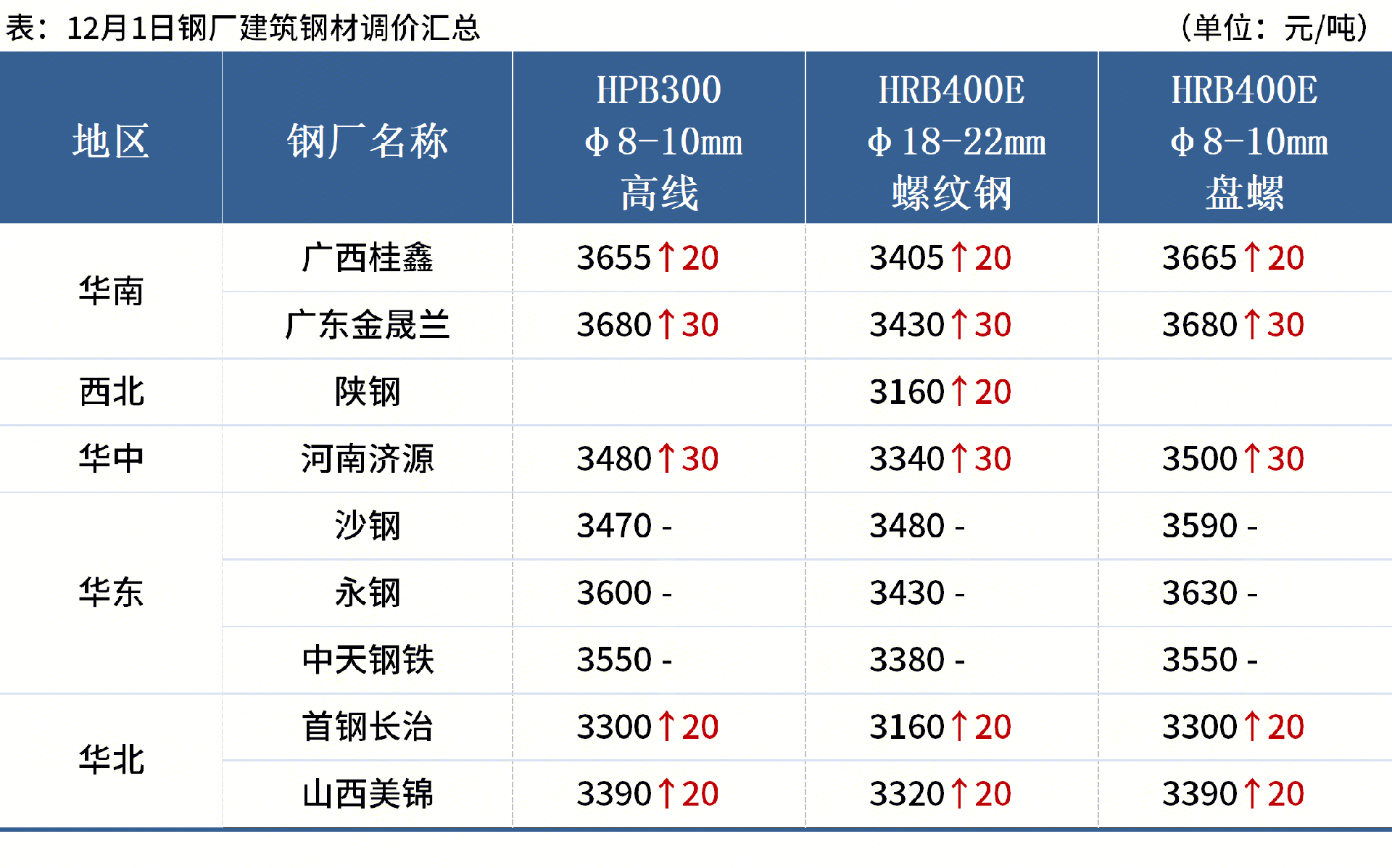 ◎12月1日,國內(nèi)6家鋼廠上調(diào)建筑鋼材出廠價20-30元/噸。沙鋼、永鋼、中天鋼鐵12月上旬建材出廠價持穩(wěn)運行。