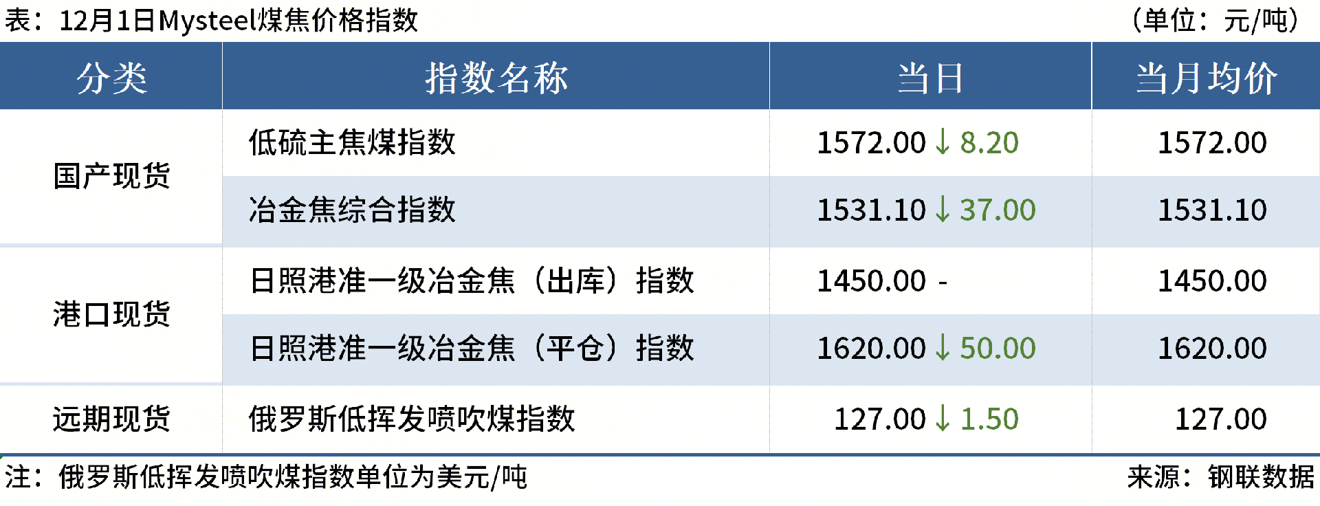 ◎12月1日,河北、山東主流鋼廠對焦炭采購價下調(diào),濕熄下調(diào)50元/噸,干熄下調(diào)55元/噸。