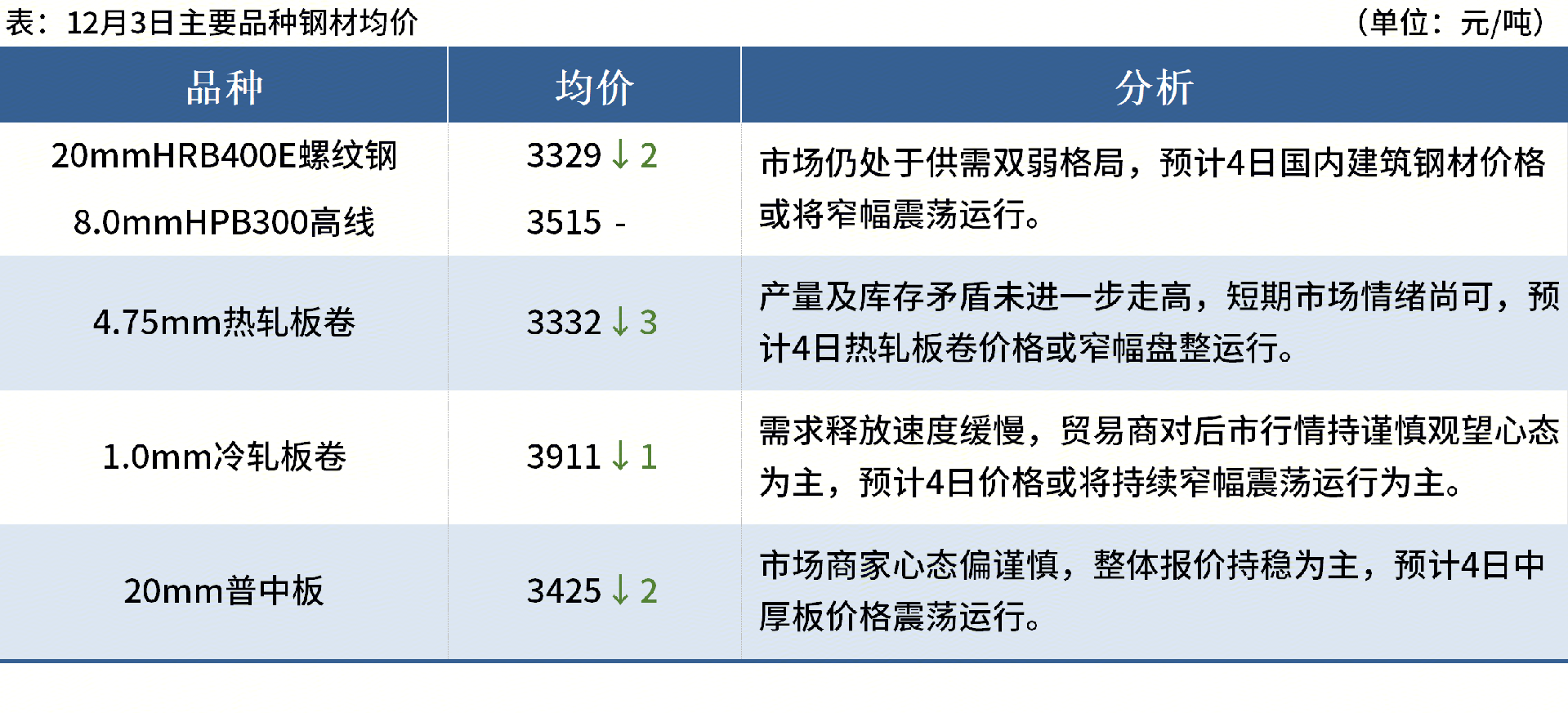 ◎12月3日,全國主港鐵礦石成交119.10萬噸,環(huán)比減4.1%;237家主流貿(mào)易商建筑鋼材成交8.98萬噸,環(huán)比減8.6%。