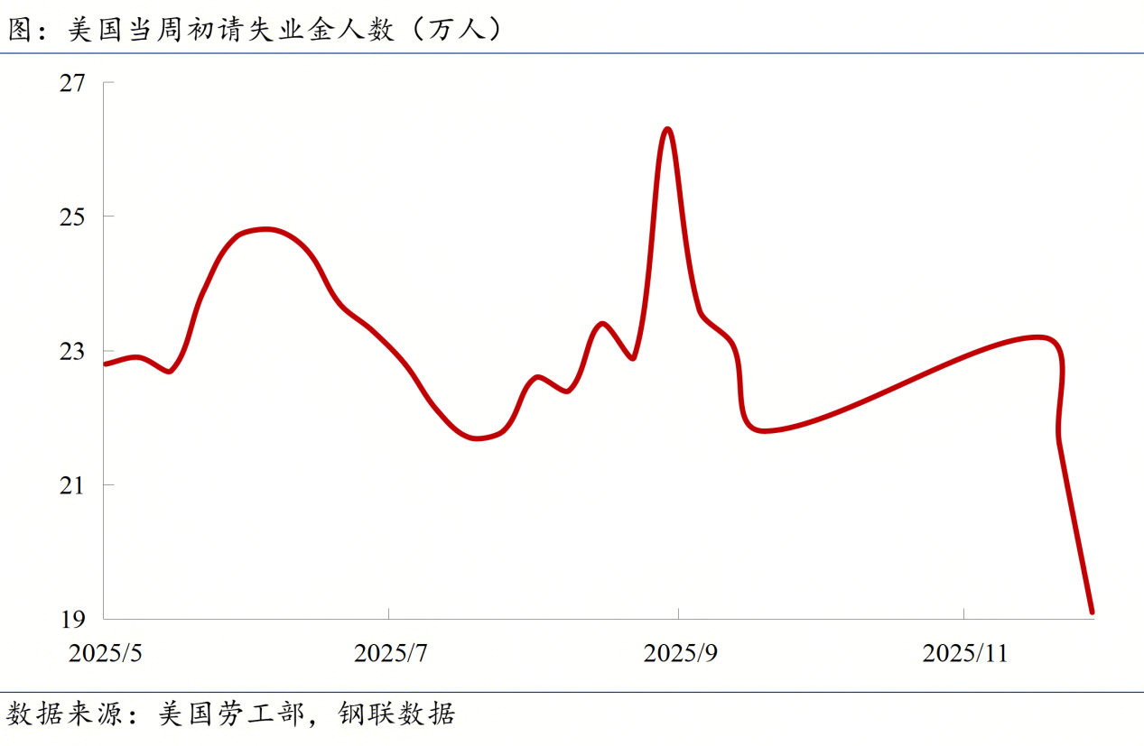 ◎ 美國(guó)勞工部官網(wǎng)顯示,11月29日當(dāng)周初請(qǐng)失業(yè)金人數(shù)意外降至19.1萬(wàn)人,遠(yuǎn)低于市場(chǎng)預(yù)期的22萬(wàn)人及前值21.8萬(wàn)人,突顯勞動(dòng)力市場(chǎng)韌性,與近期疲軟信號(hào)形成反差。